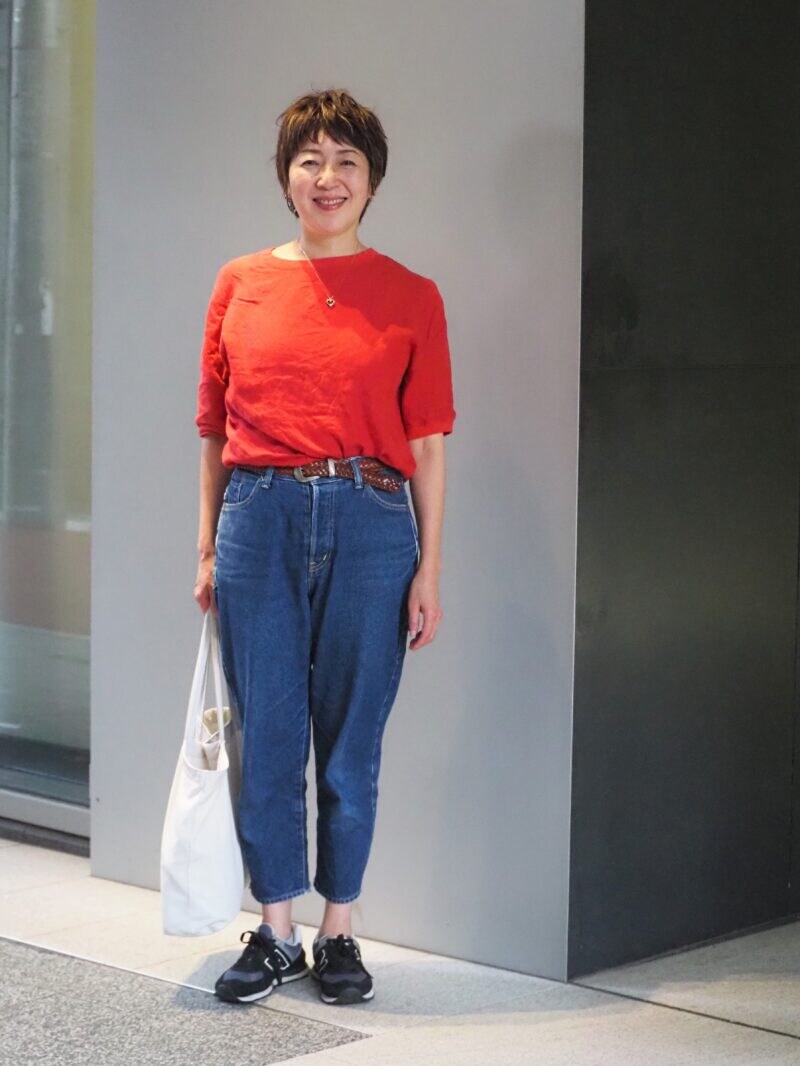 シンプルながら存在感たっぷりのトップスは、ナチュラルな風合いで大人世代にぴったり。ブルーデニムでコントラストをきかせ、足元はスニーカーでアクティブに。心地よさと動きやすさを意識したスタイリングに仕上げています。