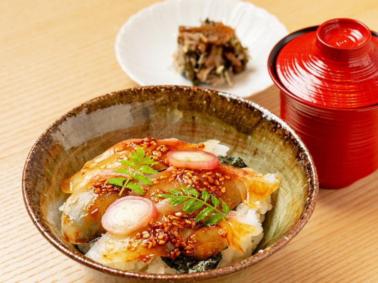 旬の素材を厳選してつくる料理は、「質実として、枯淡の境地」がコンセプト。メニューはコース料理のみで、『胡麻豆腐と季節の野菜の天ぷら』をはじめ、四季折々の味覚が堪能できます。ランチコースに通年提供される鯛の胡麻味噌ご飯は、厳選した鯛を胡麻味噌だれで和えてご飯にのせた一品。コクのある味わいで、お酒との相性も抜群です。