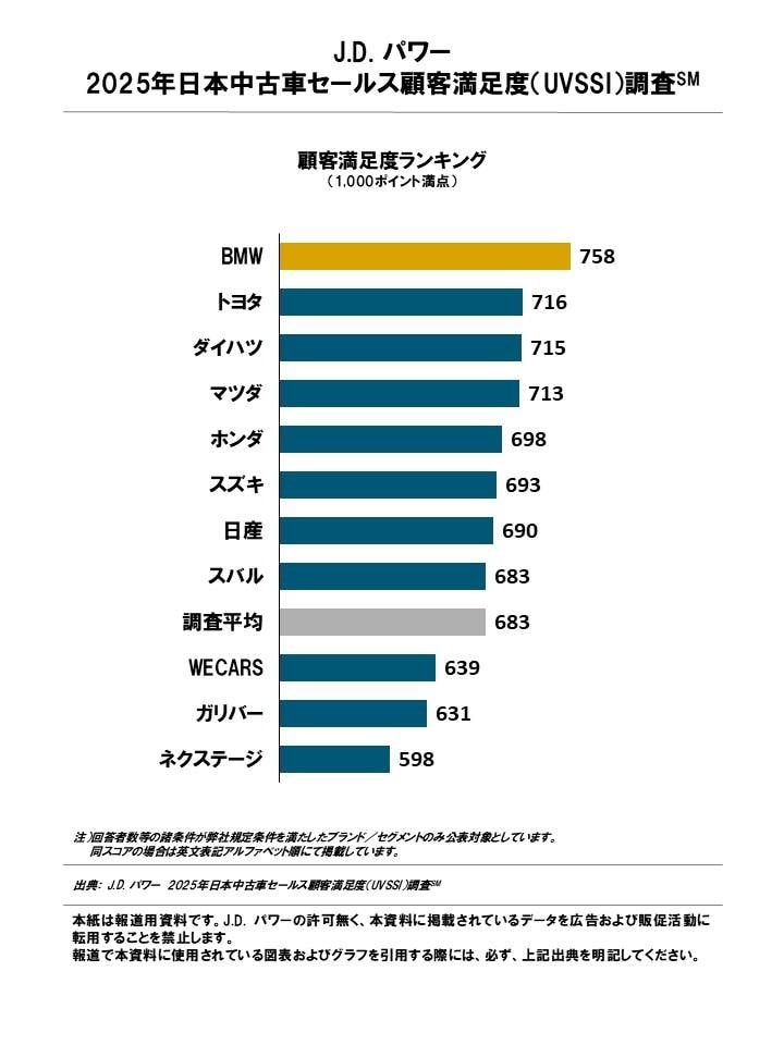 J.D. パワー 2025年日本中古車セールス顧客満足度調査 総合満足度ランキング(対象11ブランド)