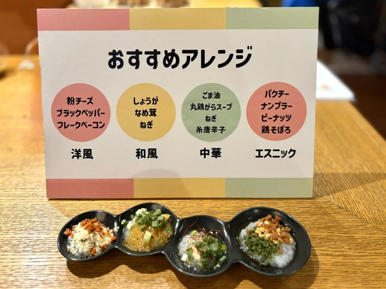 おかゆシリーズの楽しみ方として、チーズを効かせた「洋風」・しょうがやなめ茸の「和風」・ごま油がアクセント「中華」・ナンプラーで本格的「エスニック」など、目から鱗のアレンジを教えてもらいました