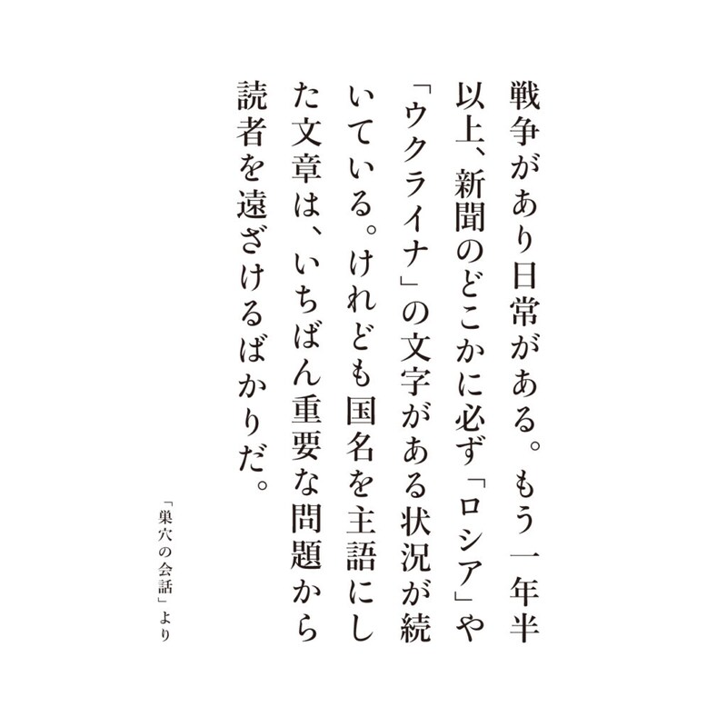 ロシア文学者の奈倉さんとお会いしたとき、自分の言葉を出すまでにいくらでも時間を使う人だったのが印象的でした。話の中で引っかかったところは見逃さないし、相手に迎合してヘラヘラしない。このエッセイ集には、彼女が長らく関わってきたロシアの状況について、実際に触れた人にしかわからないことがたくさん書かれています。どれもこういう人がいて、こんな笑い方をして、こう話した、という実体験を通した、身に沁みるような言葉です。私は時々余裕がなくて、対話の間を恐れて思ってもいないことを喋ったり、自覚なく大きな主語を使ってウケを狙ってしまうことがあります。あくまで自分自身を主語に語る、奈倉さんの言葉に込められた確かさと一種の頑なさを、すごく貴重に感じるのです。