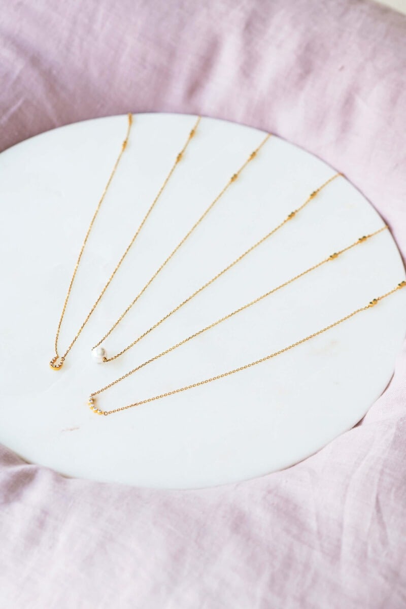 リエリィ カーブネックレス、ホースシューネックレス ともに[管理医療機器] ¥19,800、一粒パールネックレス[管理医療機器] ¥22,000/コラントッテ