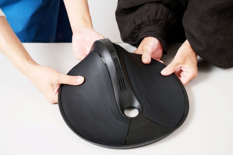 電源を入れていない状態で、ライターMと編集Mが実際に触り、素材ややわらかさなどをチェック。「素材はシリコンなのですね。フカフカして弾力があり、内側は空洞になっているようです」(編集M)。「一見硬そうに見えたのですが、触ってみるとすごくやわらかい! シリコンだから汚れがついてもサッと洗い流せるし、デザインもとてもシンプルですね」(ライターM)