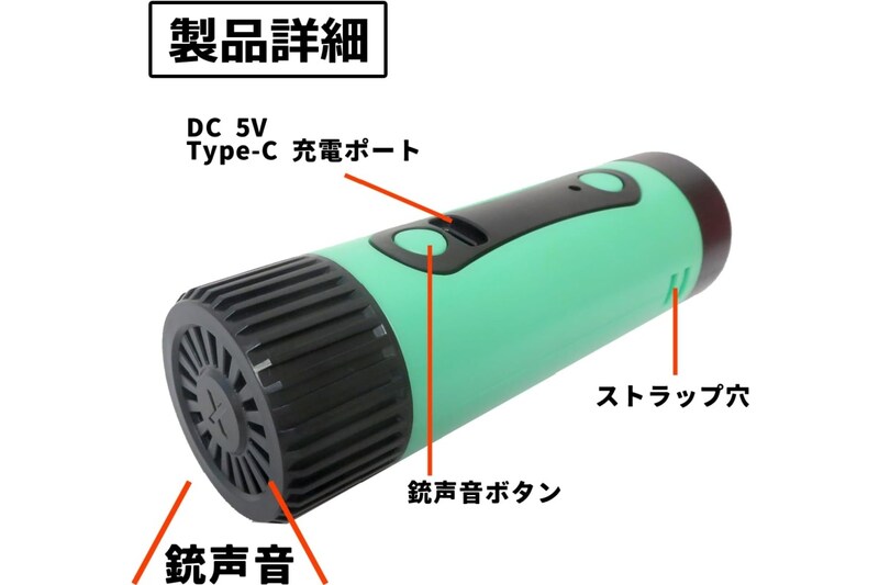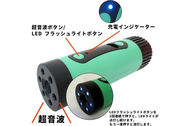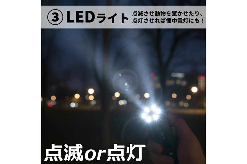 Amazonでみるさらに、LEDライトを点滅させることで視覚的にも威嚇でき、より高い撃退効果を発揮します。