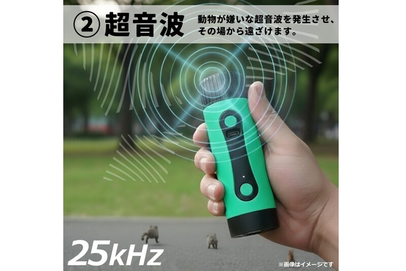 内蔵された超音波スピーカーが動物の聴覚を刺激し、効果的に接近を防ぎます。