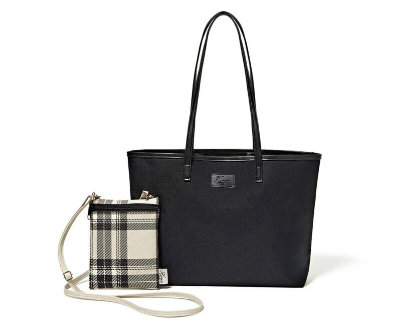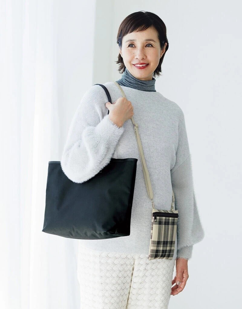 モノトーンチェックのポシェットとトートのカラーがリンクして、2個持ちもおしゃれにまとまります。