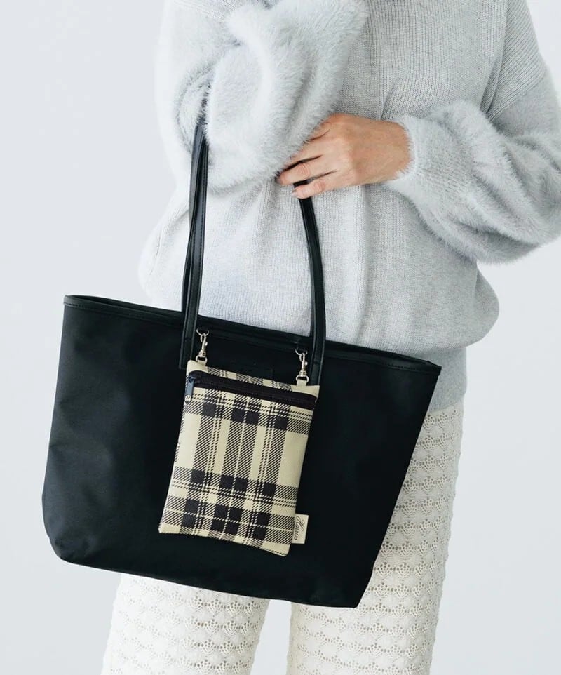 モノトーンチェックのポシェットとトートのカラーがリンクして、2個持ちもおしゃれにまとまります。