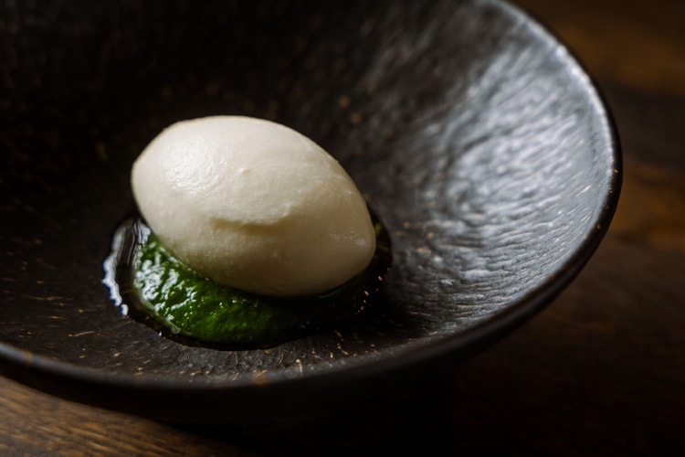 “デザートの前の小さなデザート”として供されるのが、メインディッシュの前に登場する潔い佇まいのこちら。熾火でじっくりと火入れすることで、蕪の持ち味を最大限に引き出しています。使用する牛乳にもこだわり、蕪の風味が活きるようミルク感を控えめにしたオリジナル。底に蕪の葉のピュレ、オリーブオイル、岩塩を添えることで、蕪のアイスの風味がより際立っています。蕪をそのまま味わう以上に蕪の甘みや旨みを感じることができる、食材や故郷への愛情が伝わるメニューです。