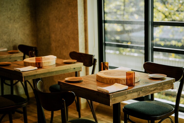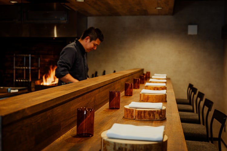 地下のカーヴをイメージしたという内装デザインは、天井が低めでどこかホッと落ち着く空間です。ウェルカムプレートとしてセッティングされた杉の木をはじめ、店内の随所に木材が使用され温かな雰囲気に。カウンター席に座ると、目の前で機敏に調理するシェフたちの姿と薪の炎を眺めることができ、料理への期待が高まります。