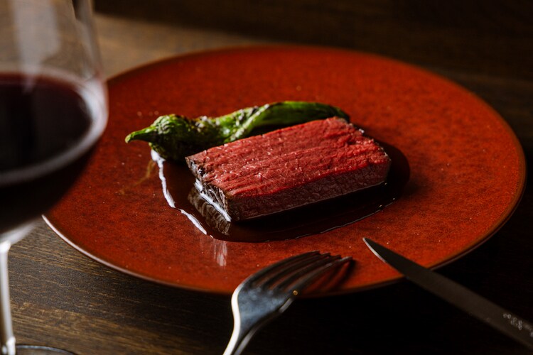 お肉は、強火で表面を焼き固めてから、スチームコンベクションなども使用しながら、最後は強火で薪の風味を一気に纏わせて出来上がり。カットした断面はうっとりするような艶やかさで、口へと運ぶと薪火ならではのしっとりとした豊かな肉質に魅了されることでしょう。ディナーコースの肉料理は2種類から選ぶことができ、取材した9月は他に『フランス ビゴール豚』も用意。営業時に焼き場を担当するのは、【傳】などで研鑽を積んだ花田光示氏。スープと共に提供するパンを自家製酵母で焼き上げるのも花田氏の担当で、ゲストから非常に好評です。