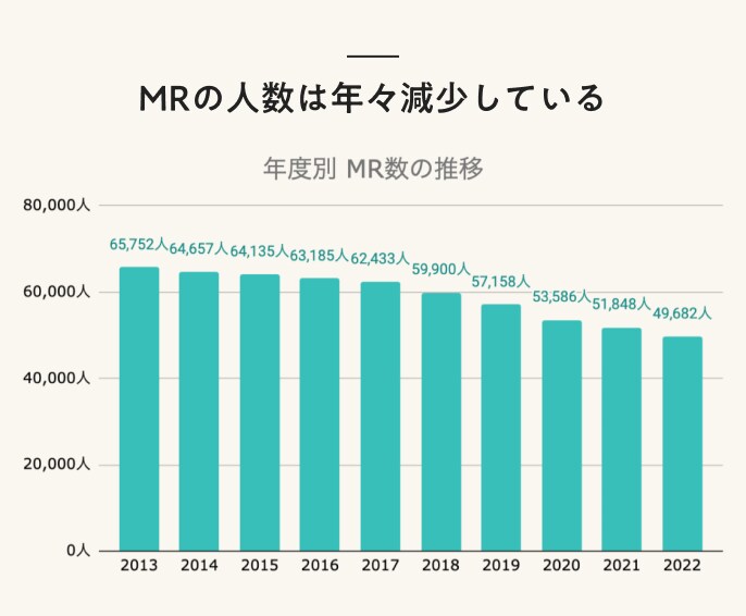 医薬品情報を扱う窓口として一定の需要はあるものの、MRの総数は減少傾向にあります。