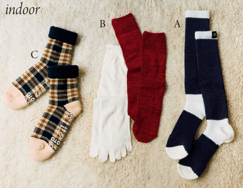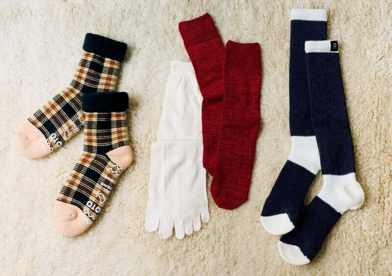 なめらかなシルク100%の5 本指ソックスと、伸縮性のあるシルクウールの靴下を重ねたら、冷え対策は万全。2 色のコントラストとストレスフリーな着用感にときめいて。