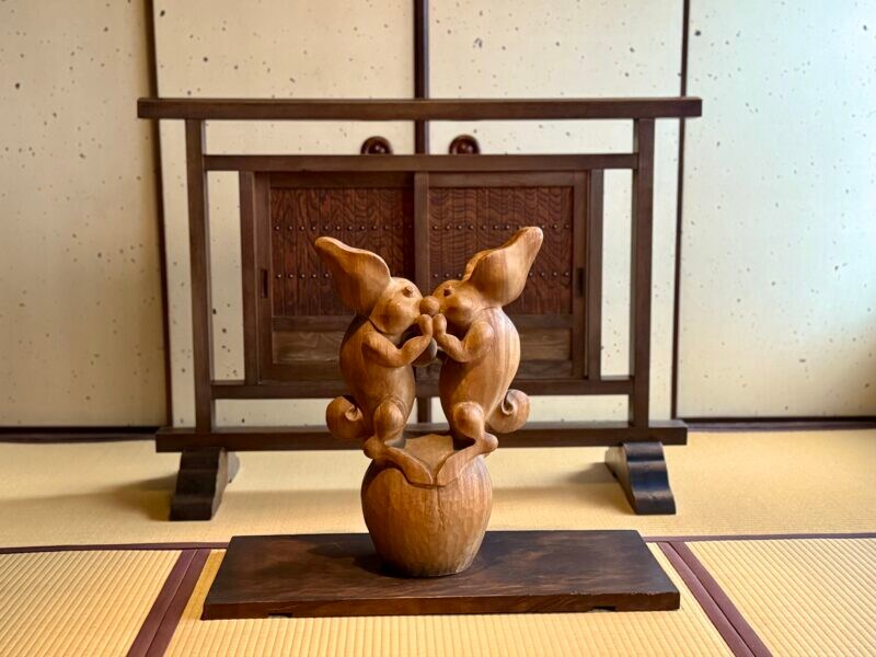 本玄関の取次の間にある木彫りのうさぎ像。河井さんは陶芸を中心に、書や詩、随筆なども残していますが、晩年にはとくに木彫りに力を入れていたそうで、多くの作品が1点ずつしか残っていないといいます。