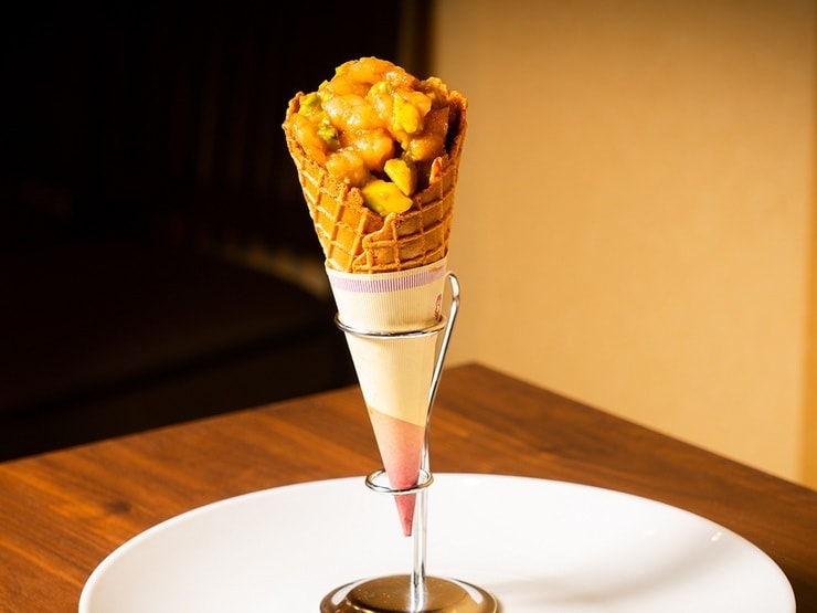スイーツのような見た目の『くずして食べる海老とアボカドのユッケ』