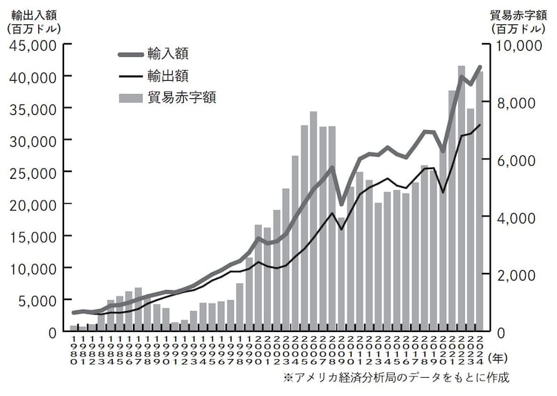 「トランプ関税」によって、貿易赤字の解消を目指すアメリカですが、その実態を数値で見てみましょう。2024年のアメリカの貿易は、輸出(財・サービス)が3兆1906億ドル(前年比+3.9%)、輸入は4兆1084億ドル(同+6.5%)でした。輸出入の差額である貿易赤字額は9178億ドル。2022年に次ぐ高水準となっています(図表1)。