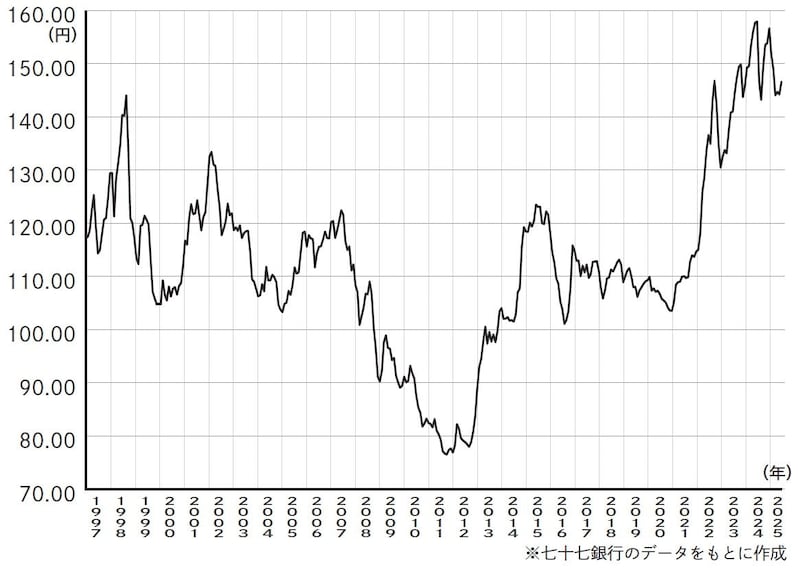 円ドルレートの推移を示している図を見ても、為替レートは常に変動していますが、2021年から急激に「円安」(つまり「ドル高」)に動いていることがわかります。なぜドル高になったのでしょうか。ミラン大統領経済諮問委員会(CEA)委員長によれば、それは、基軸通貨である米ドルに対する需要が多いからだということになります。ただし、ドル高の原因については様々な意見があり、ミラン氏の意見がかならずしも正しいとは限らないということを付け加えておきます。