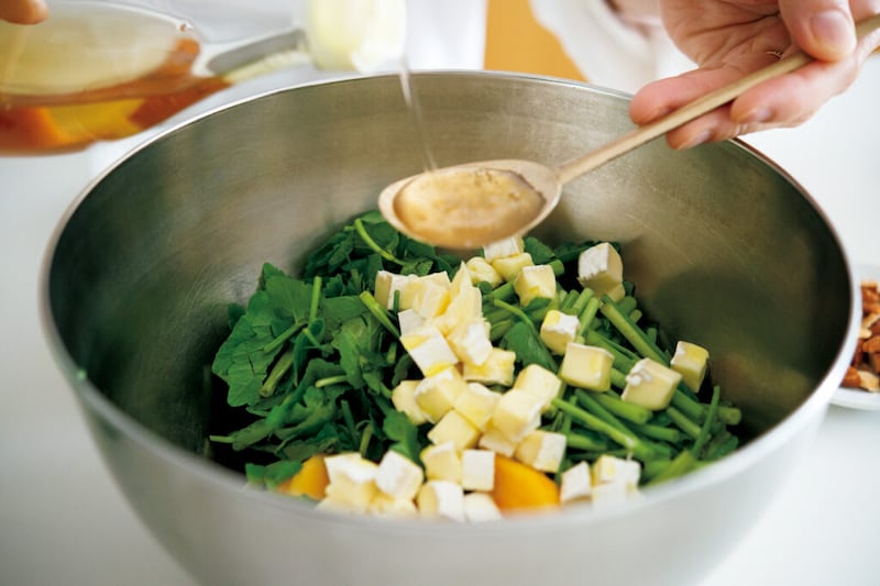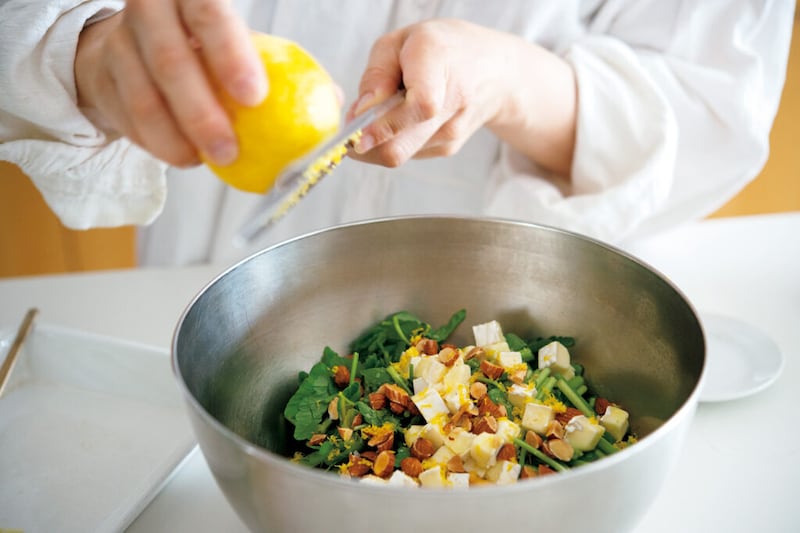3.ボウルに1と2を入れ、オリーブオイルをまわしかけ、米酢、粗塩をふる。柚子の皮を削って散らす。