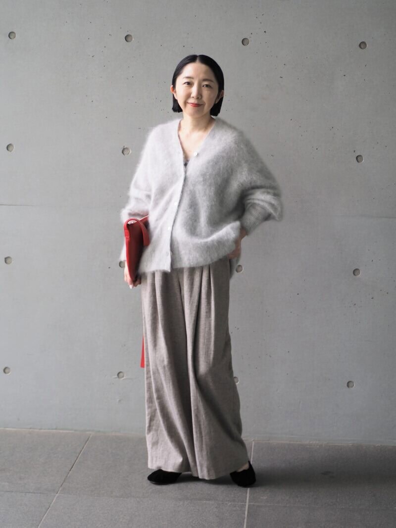 コーディネートの主役は、ふわっと空気をはらんだような質感のカシミヤカーディガン。「素材はカシミヤ100%で着心地も抜群。今季のマストバイアイテムです」。カットソーやシャツに重ねるもよし、ボタンを閉じてトップスとして着用するもよし。ボトムは落ち感のある太めのパンツをチョイス。柔らかなグレーのグラデーションも◎。