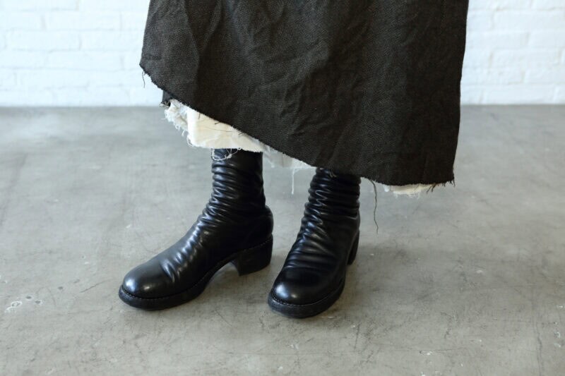 すそをカットオフしたスカートには、ハーフヒールの細身ブーツが似合います。イタリアの老舗ブランド「グイディ」のブーツは、パンツにもスカートにも合わせやすく、スタイルアップにも。