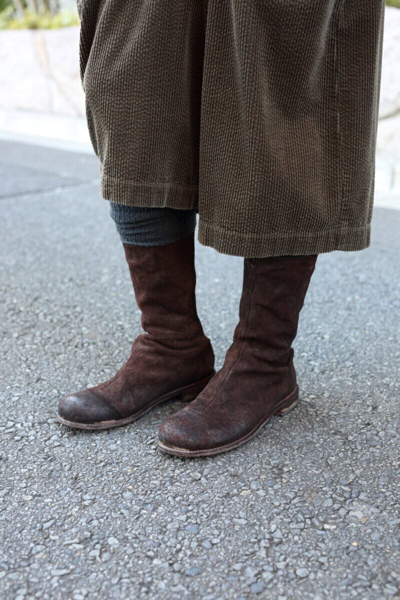 「カーキのクロップト丈パンツに、ブラウンのスエードブーツを合わせました。バックジップで着脱しやすいんです」と須田さん。表面の色ムラはエイジング加工*をしたもので、こなれた感じが魅力です。