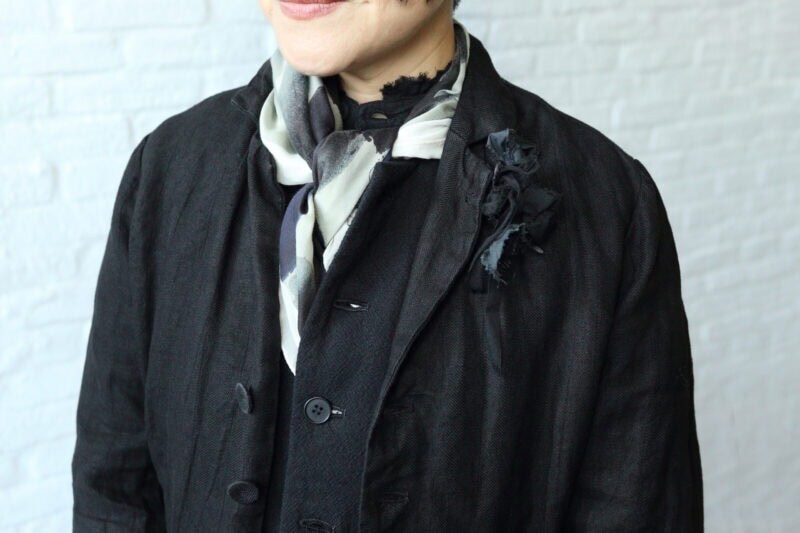 カットオフのブラウスとノンミュールジングウールのベスト、硫化染めリネンのジャケット。異素材をレイヤードしたモノトーンコーデに、シルクスカーフとラフなフラワーコサージュで抜け感と華やかさをプラスします。「このストールはニューヨーク在住のアーティスト、ウェンディ・マークさんとコラボレーションしたものです」(須田さん)