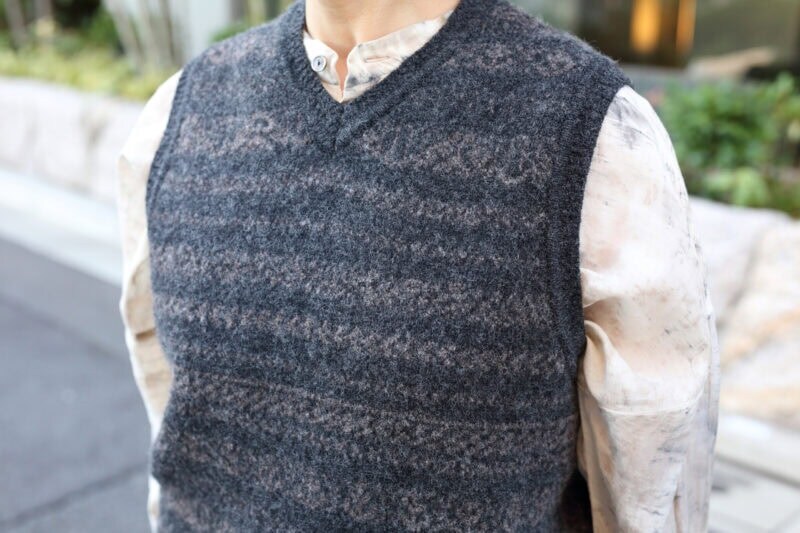 チャコールグレーをベースにしたフェアアイル柄のベストは、シャツやブラウスに重ねても、ジャケットやコートのインに着ても存在感があります。「絵を描くのが仕事なので、腕まわりがフリーなニットベストはよく着ます」と須田さん。