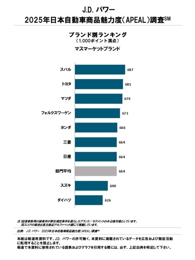 [図表1]J.D. パワー 2025年日本自動車商品魅力度(APEAL)調査℠ ブランド別ランキング<マスマーケットブランド>
