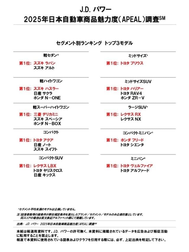 J.D. パワー 2025年 日本自動車商品魅力度調査、各部門のNo.1は以下の通り。