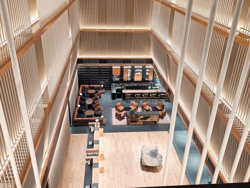 さて食事を終え、15時よりチェックインが可能とのことなので、さっそくお部屋へ。混雑しやすいロビーは、ゆとりのある上品な空間で、天井は吹き抜けになっているので、とても開放的でした。