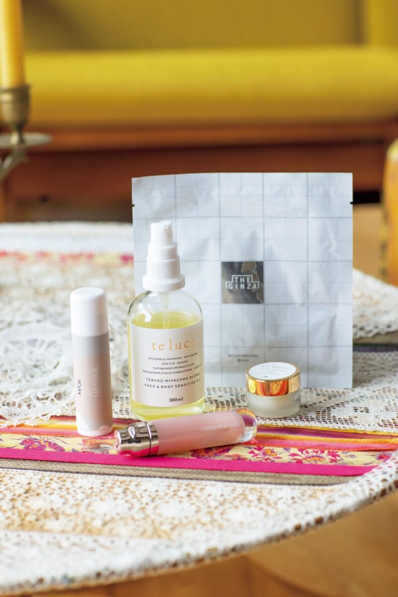 トータルケアサロン テ・ルーチェのオイルとバーム、CBDオイルの入ったリップクリームとドゥ・ラ・メールの唇用の美容液が毎日のお手入れセット。