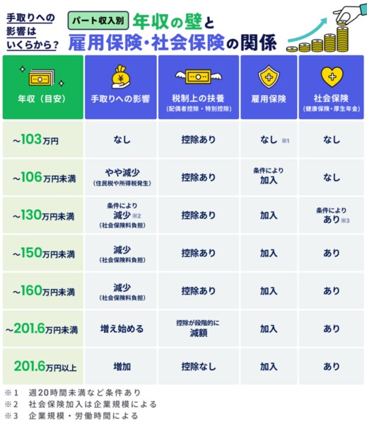【パート収入別】年収の壁と雇用保険・社会保険の関係