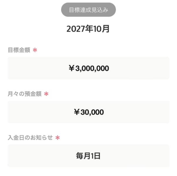 次の買い替えは8年後、280万円を検討されているとのこと。2019年の10月には消費税が上がります。車そのものの価格上昇も考えて300万円を目標にしておきましょう。「目的預金」設定で8年後の2027年までに貯めるように入力してみると毎月3万円貯めていく必要があることが分かります。大きな支出は行き当たりばったりではなく計画的に貯めるようにしていきましょう。