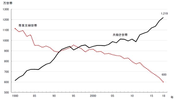 この図を見ると昭和の終わりから平成にかけて専業主婦世帯と共働き世帯が逆転しているのが分かります。2018年度では専業主婦世帯が600万世帯であるのに対し、共働き世帯は1219万世帯と倍以上になっています。