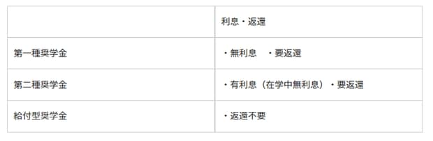 奨学金制度は主に以下のように3つに分けることができます。「貸与型」と「給付型」があり、多くは「貸与型」で「無利子」と「有利子」に分かれます。給付型は返還義務がありません。(以下表参照)