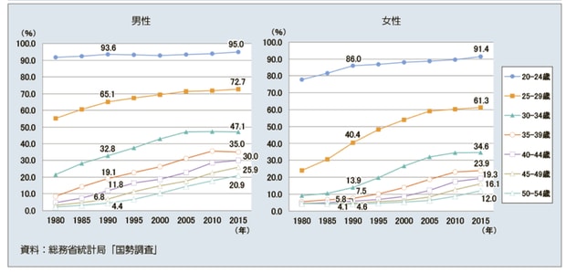 表はその時点で結婚していない人の割合を示しています。40~44歳の場合、1980年当時は男性で4.7%、女性で4.4%と結婚をしていない人の割合は1割未満でしたが、2015年時点では男性で30.0%、女性で19.3%と大幅に上昇しています。
