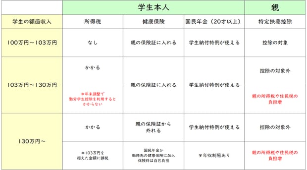 入ってくるお金を増やすという方法です。現在、アルバイトで6万~7万円の収入があるということですが、一番わかりやすいのはアルバイトの時間を増やすことでしょう。ただ大学生ということなので、いたずらにアルバイトの時間を増やすということも難しいと思います。また、Aさんは10代の大学生なので、恐らく親御さんの扶養に入っていると思います。Aさんに限らず大学生がアルバイトをしすぎると、親御さんの扶養を外れてしまうことがあるので注意が必要です。学生の収入別の影響範囲をまとめたものがこちらです。