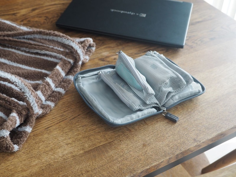 旅行の小物整理に便利な手帳型ポーチ。あちこち色々なポーチに入れていた小物がこれ1つにまとまり、しかもページをめくるように探せてすぐ見つけられます。
