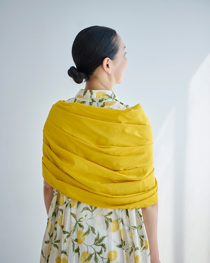 「沖縄の草木染めのブランドkitta(キッタ)の「shikifu(色布)」をストールにしています。この黄色は福木染め。東京でインスタレーションを拝見する機会が何度かあり、その際に購入しました。グラデーションで並んでいると端から端まで全部欲しくなります」