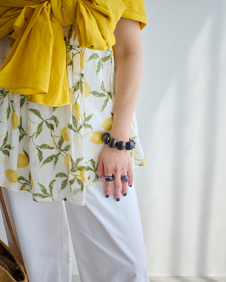 「コットンリネンのブラウスは15年くらい前のもの。当時レモン柄は他にはなくて、なんて斬新!と、今でも気に入っています」