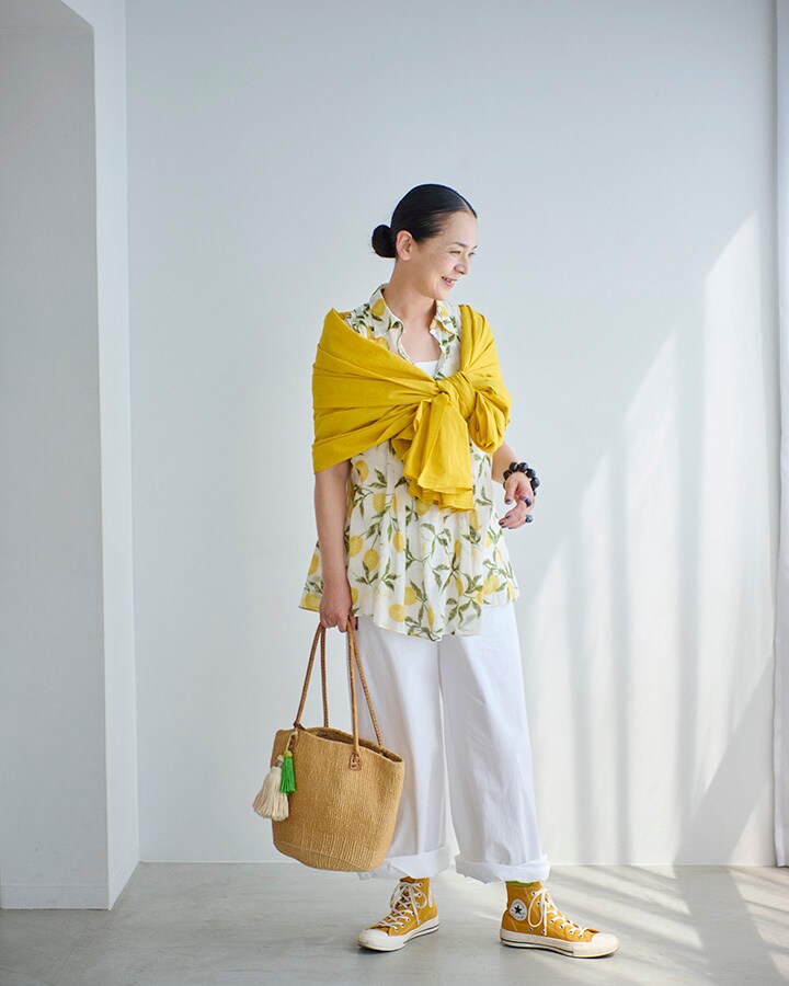 この日、都内は33度越えの残暑日。「今日は夏物ラストスパート(笑)」と優恵さん。ケイタマルヤマ トウキョウ パリスのレモン柄のブラウス×ギャルリーヴィのワイドパンツのスタイルに、kitta(キッタ)の大判ストールとコンバースのイエローが効いています。