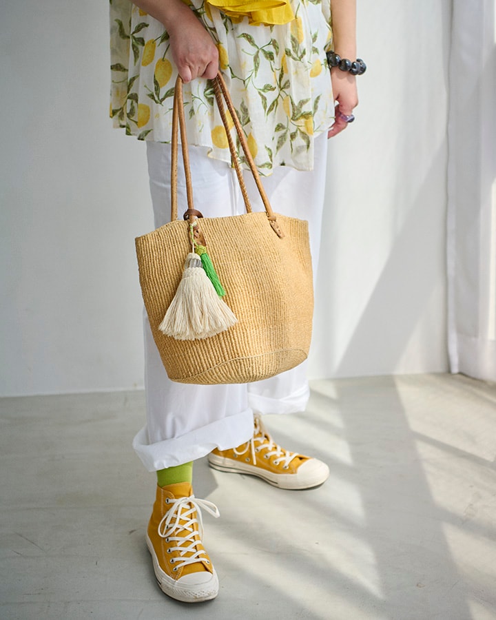 「コットンのタッセルが大好きなんです」と、かごバッグにはタッセルを2個付け。「白いのはカーテン屋さんで購入、黄緑は友人のお土産です。足元はマスタードカラーのハイカットのコンバースに、ブラウスのレモンの葉と合わせて黄緑のソックスを。コンバースは踵がすり減ってきたり、まわりのゴムが剥がれてきたら「おつかれさん」をして次の色に買い替えます」