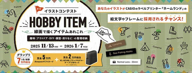 イラストコンテストの募集テーマは、DIY の工具や釣具、アウトドア用品、模型など「趣味の整理収納」。グランプリから優秀賞までの受賞者のイラストは、ネームランドのダウンロードコンテンツに採用される。さらに、Amazonギフト券、新発売の「KL-SP10-BK/KL-SP100-BK」とネームランドのテープが贈呈される。