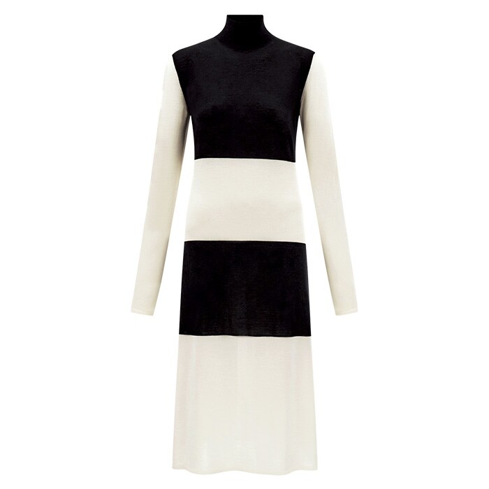 ハイゲージニットのドレスは、グラフィカルな配色がモダン。
