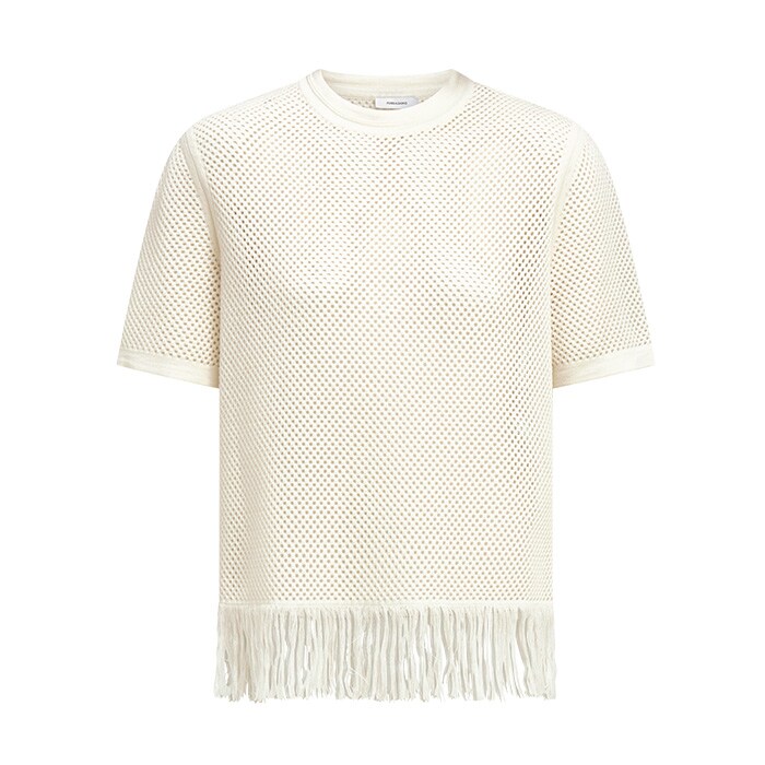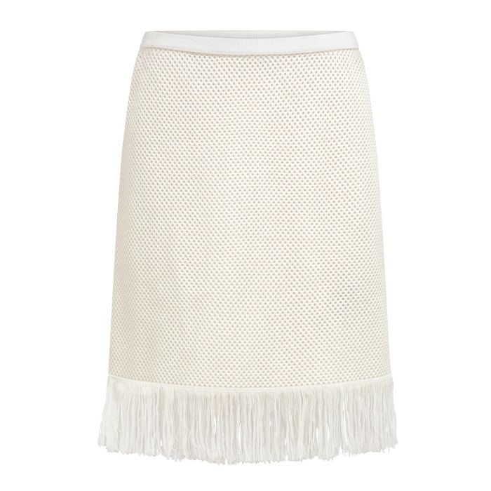 メッシュ編みとフリンジのアクセントが旬の表情を醸すニットのセットアップ。