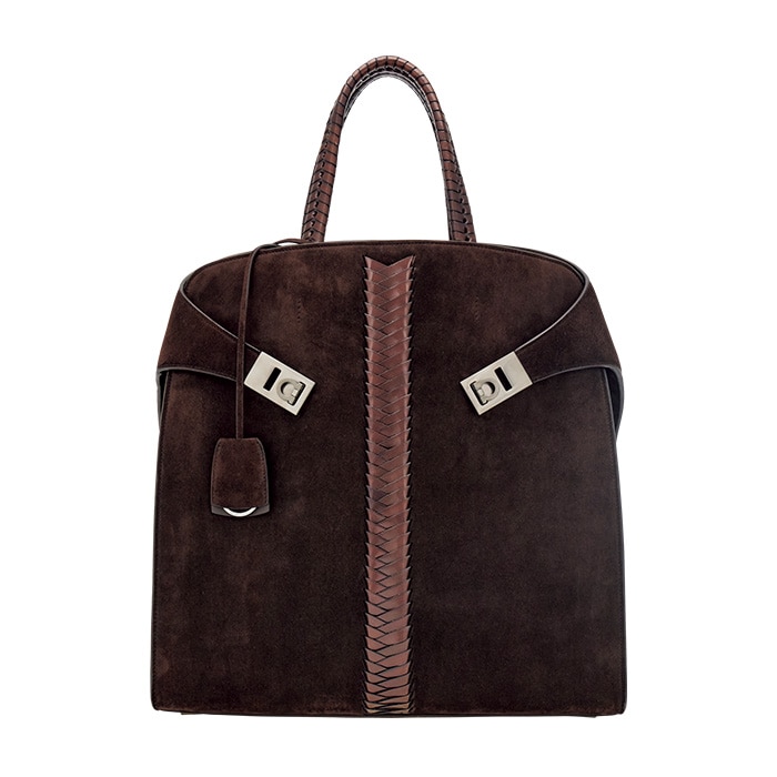 シアリングのフラップとガンチーニのクロージャーの組み合わせが存在感あふれるデザイン。レザーストラップ付き。