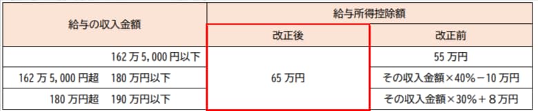 その結果、給与収入が年間190万円以下である場合、改正前は最高で55万円であったものが、一律65万円まで引き上げられました。