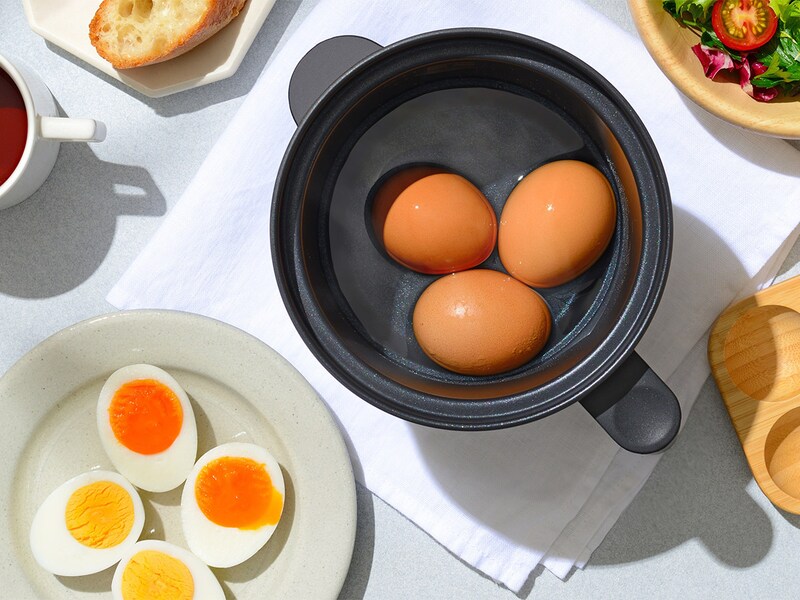 最大で210℃まで加熱することができ、白米1合なら約21分(加熱11分+蒸らし10分)で美味しく炊き上がり、また茹で卵も約200mlとカップ1杯強の水で作れます。