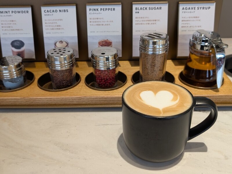 さらに、カカオニブやピンクペッパーなど、通常店舗では見かけないパウダー類で自由にカスタマイズできるのも魅力。入口付近には焼き立てのベイクコーナーがあり、テイクアウト利用もしやすい設計になっています。席数は57席と広めで、一人でも立ち寄りやすい落ち着いた雰囲気です。