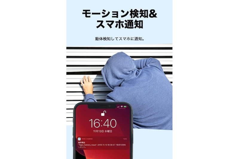 モーション検知に対応しており、動きを感知するとスマホに通知が届くため、留守中でも室内の状況をすぐに確認できます。