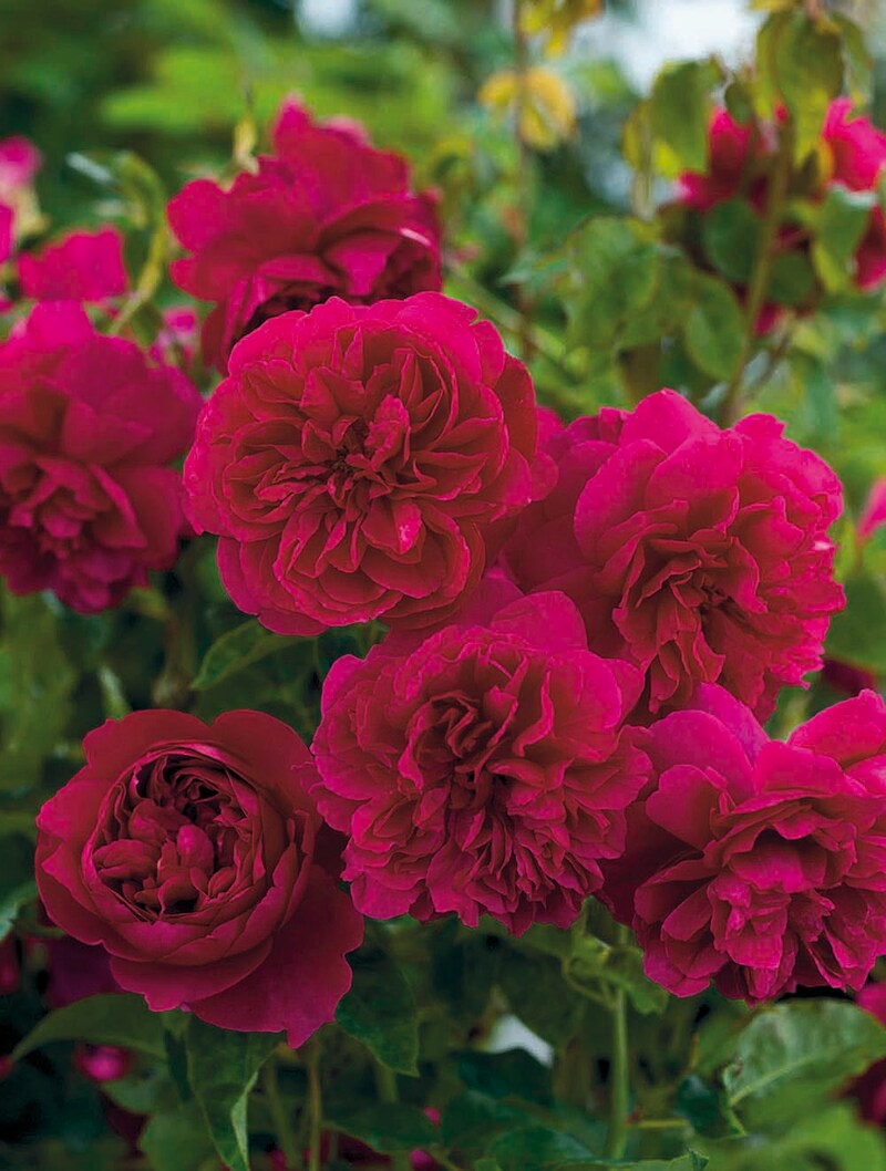 カンタベリー大聖教のために名付けられたイングリッシュローズの‘トーマス・エイ・ベケット’は、鮮やかな明るいレッドからカーマインレッドへと変化する花色が特徴です。カップ咲きからロゼット咲きになる中輪の花が房になって咲き、庭を華やかに彩ります。香りは、レモンやオレンジピールを感じさせる爽やかなティー系で、強く香ります。強健で耐病性に優れ、特に黒星病に強い特徴も見逃せません。シュラブとしてもつるバラとしても育てることができ、初心者にも扱いやすい品種です。